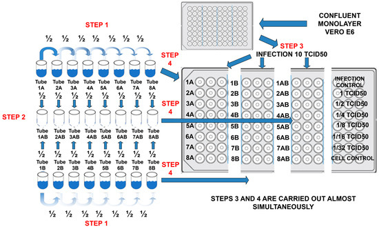 In Figure 2, the general experimental workflow design for determinations of synergisms is shown. Briefly, in a 96-well flat-bottomed plate were transferred (step 4) two-fold dilutions (step 1 and 2) of the compounds and mixed compounds to cultured confluent monolayer Vero-E6 cells which have been infected (step 3) with viral suspension (10TCID50/0.1 mL). Viral titer control is found in the upper right panel, which consisted of two-fold dilutions, starting at 1TCID50, and finalizing in the 1/32 TCID50 dilution. The lower right panel was the cell control. The center-right panel contained the double serial combination of two compounds. The IC99 data were recorded with three replicates for each compound (the IC99 average concentrations are already reported in Table 1) and the mixture of compounds. Three-component combinations reduced IC99 concentration more than binary combinations. Two experiments by triplicate for each viral type and each concentration (binary and three-component combinations) were tabulated and graphed with their standard deviation, as shown in Figure 3.