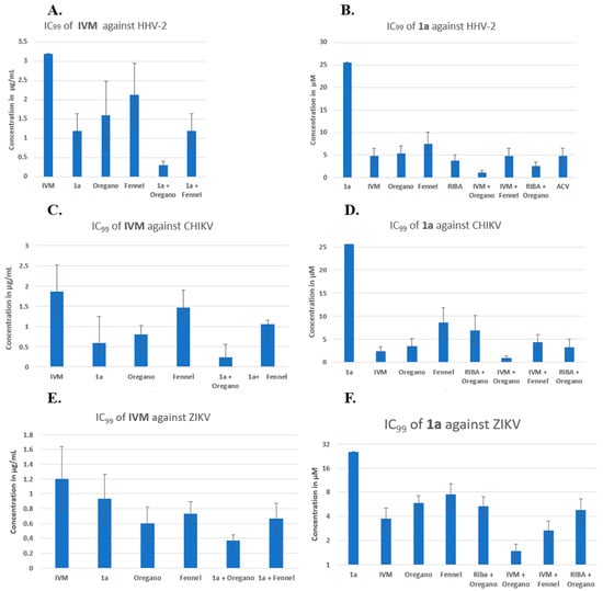 In Figure 3A (see overleaf), the IVM concentration in µg/mL is plotted on the y-axis, and the order of presentation on the x-axis is as follows: IVM, IVM/1a, IVM/oregano, IVM/fennel, IVM/(1a + oregano), and IVM/(1a + fennel). Figure 3A shows that binary combinations reduced the IVM inhibitory concentration, as the shown combination IVM/fennel displayed the least positive effect. In the last two combinations, the IVM/(1a + fennel) combination resulted in approximately the same effect as the binary combination IVM/1a. The most potent effect observed was from the ternary combination, IVM/(1a + oregano), which was greater than that of any binary combination. It should be noted that IVM alone was not able to inhibit 100% of lysis plaque formation by HHV-2 infection (the bar represents approximately 50%); this was only possible by combining with other compounds. It is clear that binary and ternary combinations of agents have potential, but the resultant data indicate that the reduction in IC99 is made significantly greater by the additional contribution of oregano EO in combination with two other components. In Figure 3B, the compound 1a concentration in µM is plotted on the y-axis, and the order of presentation on the x-axis is as follows: 1a, 1a/IVM, 1a/oregano, 1a/fennel, 1a/RIBA, 1a/ACV, 1a/(IVM + oregano), and 1a/(IVM + fennel). The binary combinations of 1a with IVM, oregano EO, fennel EO, RIBA, and ACV reduced the IC99 of compound 1a generally around five times from 25.6 to ca. 5 µM. The three-component 1a/(IVM + oregano) and 1a/(IVM + RIBA) mixtures reduced the concentration much more at values below 5 µM; the oregano-based ternary mixture including IVM makes a big difference in the reduction of IC99. For combinations of three compounds, the descending order of effectiveness was: 1a/(IVM+ oregano) > 1a/(oregano+ RIBA) > 1a/(IVM+ fennel). The IC99 reduction by binary and/or three-component combinations was more evident when the analysis was performed from 1a (Figure 3B). This could be because 1a has the highest value of IC99 concentration, and the two-fold dilutions used show per se a greater effect (12.8, 6.4, 3.2, 1.6, 0.8, 0.4). Control drugs (RIBA and ACV) were combined with 1a; both compounds reduced the IC99 of 1a from 25 µM to approximately 5 µM. In the subsequent experiments for the CHIKV and Zika viral models, only RIBA was used as a control since this drug possesses broad-spectrum properties.