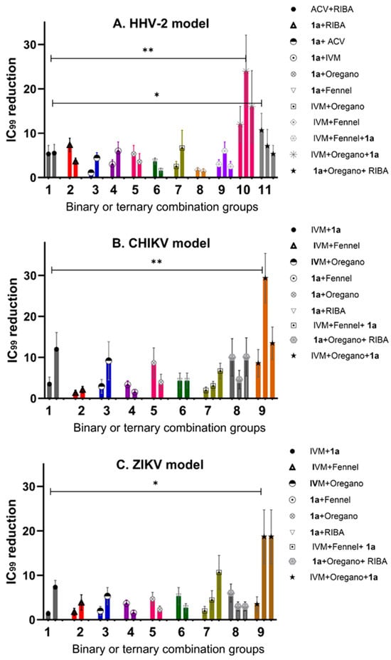 Reduction in IC99 inhibitory concentration (number of times) for the different models (A) (HHV-2), (B) (CHIKV), and (C). ZIKV in binary and ternary combinations. Differences in p-value greater than 0.05 were considered statistically not significant (n.s.), while groups with p-values of significance are indicated by ** for p = 0.0098 and * for p = 0.0390.