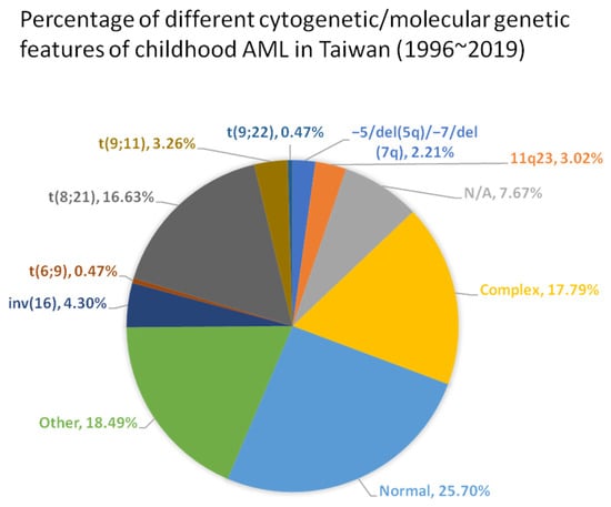 Percentage of different cytogenetic/molecular genetic features of childhood AML in Taiwan (1996~2019). The pie chart showed the percentages of different genetic subtypes in childhood AML diagnosed between 1996 and 2019. The total number of patients enrolled was 860. (Adapted from Table 2 in Yang et al., 2021 [9]).