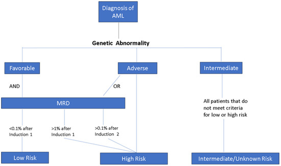 Recommended risk classification based on genetic alterations using prognostically important genetic abnormalities in childhood AML and MRD (minimal residual disease), adapted from [8].