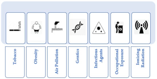 Cancer, an intricate and multifaceted ailment, is influenced by a diverse array of factors, which collectively contribute to its development (Figure 2). These factors encompass various dimensions, including lifestyle choices, environmental surroundings, genetic predisposition, infectious agents, occupational exposure, and ionizing radiation. Recognizing the profound impact of these risk factors is pivotal for advancing comprehensive strategies aimed at diminishing vulnerabilities and heightening awareness to preclude the occurrence of cancer. A holistic comprehension of the manifold constituents contributing to the intricacies of cancer is imperative for crafting effective frameworks for prevention and control. In this endeavor, public health initiatives take center stage, prioritizing endeavors that encompass risk mitigation, early detection, and education. These initiatives play a pivotal role in ameliorating the escalating pervasiveness of cancer. By methodically addressing these underlying risk elements, we can catalyze significant progress in alleviating the toll that cancer exacts on individuals and communities across the globe [25].