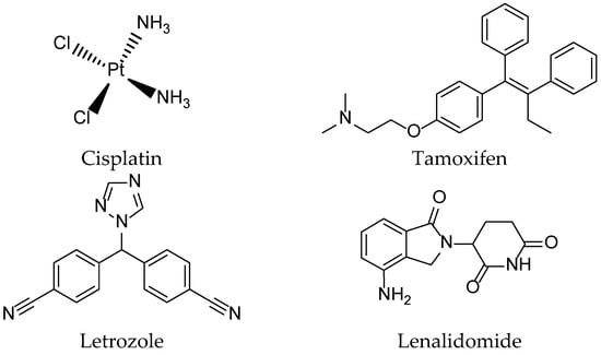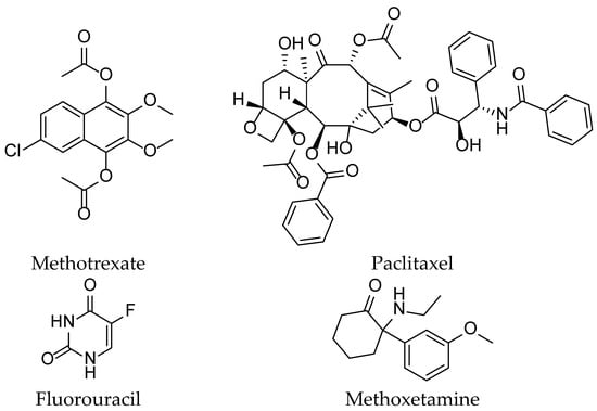 Clinical cancer treatments encompass a diverse range of therapeutic strategies aimed at combating the disease at its molecular and cellular levels. Among the active agents used in these treatments (Figure 4 and Figure 5), chemotherapy remains a commonly employed approach, with agents such as methotrexate, doxorubicin, cyclophosphamide, paclitaxel, docetaxel, fluorouracil (5-FU), methoxetamine, gemcitabine, cisplatin, and carboplatin. Targeted therapies, on the other hand, focus on specific alterations present in cancer cells, utilizing drugs such as trastuzumab (Herceptin), rituximab (Rituxan), imatinib (Gleevec), erlotinib (Tarceva), and gefitinib (Iressa) [66].
