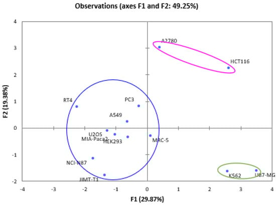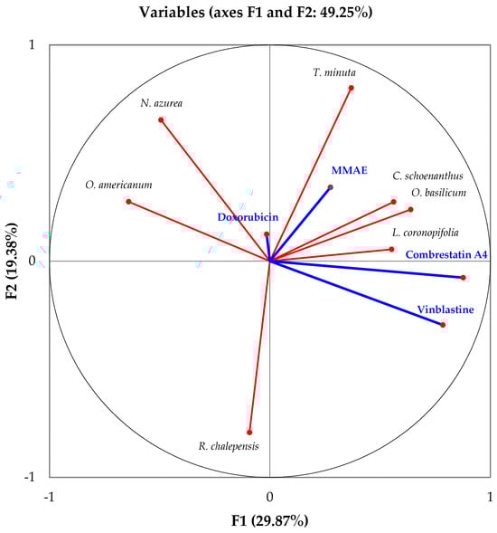 In the specific context of the utilization of Djibouti’s essential oils in cancer treatments, Principal Component Analysis (PCA) serves as a mathematical tool aimed at unraveling intricate interdependencies among diverse parameters. The primary aim within this framework was to effectively visualize and consolidate data concerning the efficacy of IC50 values, as previously referenced, pertaining to Djibouti’s essential oils, along with vinblastine, doxorubicin, combrestatin A4, and monomethylauristatin E [19,20,21,22]. This endeavor was carried out to highlight divergences in values observed across the tested cancer cell lines, thereby facilitating a concise and comprehensible presentation. Specifically, PCA facilitated the categorization of the scrutinized cell lines into clusters, thus revealing associations through the active compound. In pursuit of this objective, coding methodologies were strategically employed [22], anchored in the IC50 values extracted from each sample within the cancer cell lines. The intricate numerical dataset that underpins the foundation of this model was meticulously recorded and is detailed in Table 1.