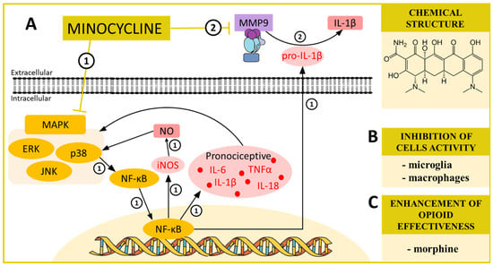 (A) The possible mechanisms of minocycline action as indicated by various in vivo ➀➁ and in vitro ➀➁ studies: ➀ inhibition of MAP kinases by minocycline in turn indirectly inhibits NF-κB, and as a consequence, the production of pronociceptive cytokines such as IL-6, IL-1β, IL-18 and TNFα [26,82] and also evokes the inhibition of the inducible nitric oxide synthase (iNOS) production, which prevents p38 activation by nitric oxide (NO) [81]—blockade of the synthesis of pronociceptive factors may be the cause of the analgesic effect of minocycline; ➁ inhibition of MMP9, which attenuates the transformation of inactive proIL-1β to the active, pronociceptive IL-1β [73,102]. (B) The influence of minocycline on activation of cells important for neuropathic pain development as proposed by in vitro [26,83] and in vivo [26,83] studies; and (C) the influence of minocycline on opioid effectiveness in neuropathic pain models [74]. Abbreviations: mitogen-activated protein kinases (MAPK); extracellular signal-regulated kinase (ERK); p38 mitogen-activated protein kinase (p38); c-Jun N-terminal kinase (JNK); nuclear factor kappa B (NF-κB); inducible nitric oxide synthase (iNOS); nitric oxide (NO); matrix metalloproteinase 9 (MMP9); tumor necrosis factor α (TNFα); interleukin 1 beta (IL-1β); interleukin 6 (IL-6); interleukin 18 (IL-18).