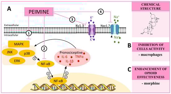 (A) The possible mechanisms of peimine action as indicated by various in vitro ➀➁➂➃ studies: ➀ inhibition of MAP kinases by peimine, which in turn inhibits NF-κB, and, as a consequence, the production of pronociceptive cytokines such as IL-6 or IL-1β [91]; ➁ inhibitory effects of NF-κB, which causes a decrease in the synthesis of pronociceptive factors [195]; ➂ inhibition of the Kv1.3 potassium channels, which are involved in the maintenance of persistent pain [93]; ➃ inhibition of the Nav1.7 sodium channels, which are involved in the development of hypersensitivity [93]. (B) The influence of peimine on the activation of cells important for neuropathic pain development as proposed by in vitro studies [199]; and (C) the influence of peimine on opioid effectiveness in neuropathic pain models [90]. Abbreviations: mitogen-activated protein kinases (MAPK); extracellular signal-regulated kinase (ERK); p38 mitogen-activated protein kinase (p38); c-Jun N-terminal kinase (JNK); nuclear factor kappa B (NF-κB); tumor necrosis factor α (TNFα); interleukin 1 beta (IL-1β); interleukin 6 (IL-6).