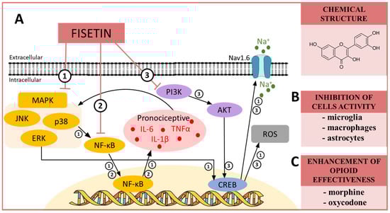 (A) The possible mechanisms of fisetin action as indicated by various in vivo ➀➁ and in vitro ➂ studies: ➀ inhibition of MAP kinases by fisetin, which in turn indirectly inhibits NF-κB, and, as a consequence, the production of pronociceptive cytokines, such as IL-6, IL-1β and TNFα [100], is lowered;➁ influence on NF-κB activation, which causes a decrease in the synthesis of pronociceptive factors [97]; ➂ inhibition of PI3K/AKT, which in turn influence the cAMP-response element binding protein (CREB) that impacts the expression of Nav1.6 sodium channels, which reduces hypersensitivity but also decreases the production of ROS, which are confirmed to be responsible for the maintenance of neuropathic pain [61,96,233]. (B) The influence of fisetin on the activation of cells important for neuropathic pain development as proposed by in vitro studies [94,234]; and (C) the influence of fisetin on opioid effectiveness in neuropathic pain model [90]. Abbreviations: mitogen-activated protein kinases (MAPK); extracellular signal-regulated kinase (ERK); p38 mitogen-activated protein kinase (p38); c-Jun N-terminal kinase (JNK); nuclear factor kappa B (NF-κB); tumor necrosis factor α (TNFα); interleukin 1 beta (IL-1β); interleukin 6 (IL-6); reactive oxygen species (ROS); phosphoinositide 3-kinase (PI3K); protein kinase B (AKT); cAMP response element-binding protein (CREB).