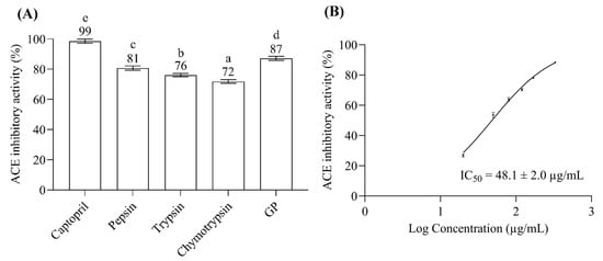 (A) ACE inhibitory activity of 1.6 µM of captopril as positive control and 0.33 µg/µL of BGSP hydrolysates generated by pepsin, trypsin, α-chymotrypsin, and gastrointestinal protease (GP) as testing samples. Different letters mean significant differences among testing samples (p < 0.05). (B) The half-maximal ACE inhibitory concentration of BGSP-GP hydrolysate.