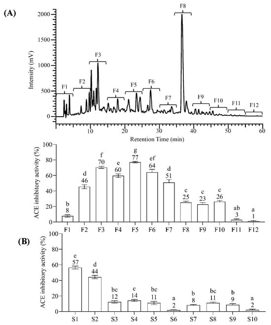 (A) Bioassay-guided RP-HPLC fractionation; (B) Bioassay-guided SCX fractionation. The concentration of each fraction was 0.17 mg/mL. Different letters mean significant differences among testing samples (p < 0.05).