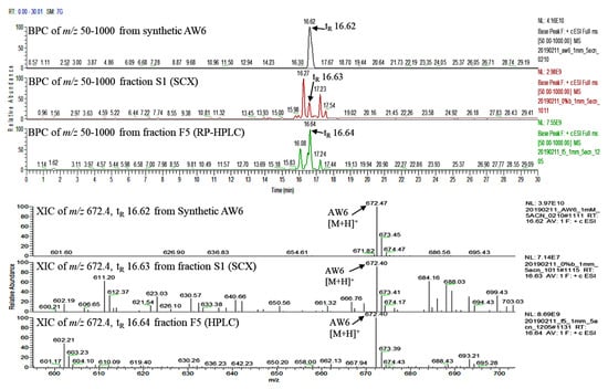 Base peak chromatogram (BPC) and extracted ion chromatogram (XIC) from LC–MS analysis of synthetic AW6 (top), fraction S1 from SCX (middle), and fraction F5 from RP–HPLC (bottom).
