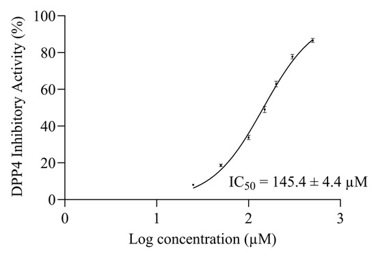 The 50% inhibitory concentration (IC50) is the most common and empirical indicator to measure the efficacy of a substance [25,26]. A non-linear interpolation was generated by seven logarithmic concentrations of synthetic AW6 versus their ACEI activities to determine the 50% ACE inhibitory concentration of AW6 (ACEI IC50). The ACEI IC50 of AW6 was determined to be 9.6 ± 0.3 µM, as shown in Figure 4. The ACEI IC50 of AW6 seems comparable to other ACEI peptides derived from BGSP thermolysin hydrolysate (VY7, IC50 = 8.6 µM, VG8, IC50 = 13.3 µM) [20] and showed favorable inhibition compared to sicklepod seeds (FK6, IC50 = 16.8 µM) [27], barley (FF6, GF8, NF6, AM6, IC50 value range from 28.2–200 µM) [28], and rice bran (YK3, IC50 = 76 µM) [29], as previously reported. The half-maximal DPP4 inhibitory concentration (DPP4I IC50) of AW6 was also determined by a non-linear interpolation. Using seven logarithmic concentrations of AW6 versus their DPP4I activities, the AW6 DPP4I IC50 value is estimated to be 145.4 ± 4.4 µM, as shown in Figure 5. Referring to the DPP4 inhibitory IC50 value derived from other plant seeds, such as napin of rapeseed (IS5, EL8, PF5, KP6, IC50 value range from 52.2–162.7 µM) [30], soybean glycinin (IA7, IC50 = 106 µM), and lupin seed β-conglutin (LD9, IC50 = 228 µM) [31], AW6 derived from BGSP-GP hydrolysate showed comparable DPP4 inhibitory activity. It is suggested that peptides with N-terminal Ala, Gly, Ile, Pro, Met, Glu, and Val, and the presence of Pro or Ala at the second position of the N-terminal, are preferred for inhibiting DPP4 [32]. Moreover, peptides containing aliphatic and hydrophobic amino acids (Ala, Val, Leu, Ile, Met, and Pro) with C-terminal aromatic side chain peptides (Tyr, Phe, and Trp) showed a strong influence on inhibiting ACE [4]. AW6 (APLVSW) has aliphatic residues at its N-terminus, a proline at the second position, several hydrophobic residues in the middle, and an aromatic tryptophan at the C-terminus. These specific features might facilitate significant contributions to ACE and DPP4 inhibitory activity.