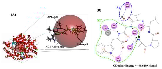 (A) Molecular docking study of AW6 and ACE (PDB code = 1O86) in 3D visualization. The red, transparent sphere represents the catalytic site of ACE. The green molecule is the lisinopril originating from the ACE–lisinopril complex (PDB code = 1O86), and the APLVSW (AW6) is visualized using a stick form with CPK atom color style. (B) The 2D visualization of intermolecular interaction between AW6 and ACE. The green and blue dashed lines indicate S2′ and S1 ACE active pockets that formed interactions with AW6, respectively.