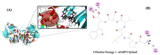 Molecular docking study of AW6 and DPP4 (PDB code = 1WCY). (A) The 3D visualization of how diprotin A interacts with the DPP4 catalytic site (the red, transparent sphere), and the APLVSW (AW6) forms interactions with DPP4 residues other than the catalytic sites. (B) The 2D visualization of intermolecular interaction between AW6 and DPP4.