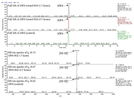 In vitro ACEI activity of peptides is sometimes inconsistent with their in vivo antihypertensive activity, which is based on their stability toward gastrointestinal protease enzymes and brush-border membrane peptidases in the digestive system [36], and biologically active peptide products are usually administered orally. Thus, investigating the alterations in peptide activity caused by gastrointestinal digestion is crucial. AW6 was derived using gastrointestinal protease digestion. Theoretically, the same proteolytic enzyme will not cleave it. To emulate AW6 stability during human gastrointestinal digestion, AW6 was mixed with pepsin for 1.5 h at 37 °C (pH 2.0), continued by α-chymotrypsin and trypsin (pH 8.0) digestion for 3 h. The stability of AW6 was observed using LC-MS (Figure 10). As expected, the AW6 was not hydrolyzed during the simulation of gastrointestinal digestion. The leucine in the antepenultimate N-terminal of AW6 was not cleft by gastrointestinal protease (pepsin or α-chymotrypsin), which may be due to the presence of the N-terminal penultimate proline residue that could improve the SGI digestion resistance of AW6 [37]. Also, AW6 features a low molecular weight (<3 kDa) and usually shows more resistance during SGI digestion than peptides with a higher molecular weight [38]. Therefore, the resistance of AW6 during SGI digestion suggests that AW6 is a promising biologically active peptide candidate for developing functional foods and therapeutic agents with ACE and DPP4 inhibitory activity.