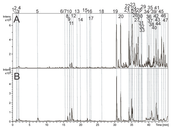 Base peak chromatograms were obtained in positive ion mode from the aqueous (A) and hydroalcoholic (B) extracts of P. amalago leaves. Details of peak numbers are described in the text.