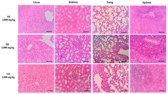 Histopathological evaluation of organs from female rats treated with a single oral dose (2000 mg/kg) of AE, HE, and VO in the acute toxicity test. H&E stain (40×). Scale bars = 100 μm. AE: aqueous extract; HE: hydroalcoholic extract; VO: volatile oil.