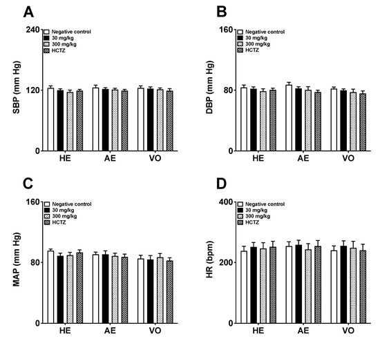 After seven days of treatment, the animals receiving AE, HE, VO, or HCTZ did not show any significant reduction in SBP, DBP, MAP, and HR values compared to the negative control rats (as shown in Figure 3A–D).