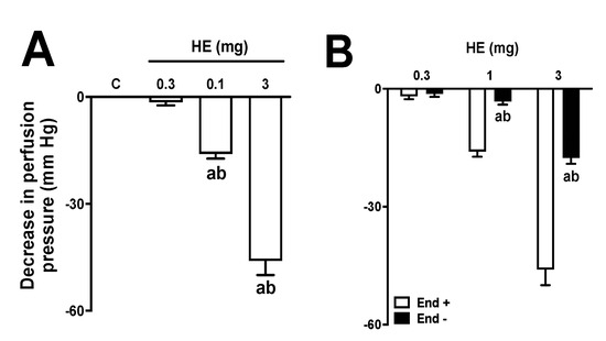 Effects of hydroalcoholic extract (HE) on the vascular tone of mesenteric vascular beds (MVBs) in the presence and absence of endothelium. MVBs were perfused with PSS containing Ach (3 μM) in the intact (A) or denuded endothelium (B), and the vasorelaxant effect of HE was evaluated. The results show the mean ± standard error of the mean of 4 or 5 preparations. In graph A, the letter a indicates p < 0.05 compared to the control group (vehicle); b indicates p < 0.05 compared to the previous dose. In graph B, the letter a indicates p < 0.05 compared to the effects of HE on the intact endothelium; b indicates p < 0.05 compared to the previous dose. Statistical analysis was performed using one-way ANOVA followed by Dunnett’s test. End − and End +: denuded and intact endothelium, respectively.