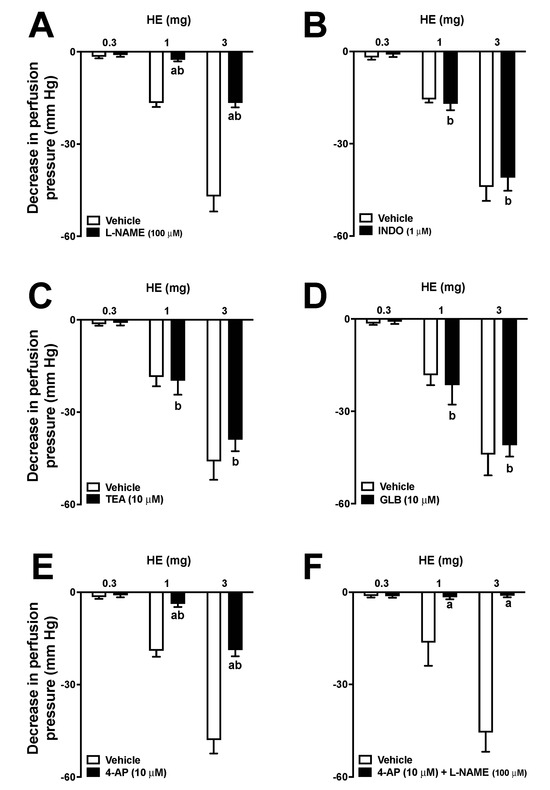 Effects of hydroalcoholic extract (HE) on the vascular tone of mesenteric vascular beds (MVBs) on the presence and absence of L-NAME (100 μM) (A), indomethacin (1 μM) (B), TEA (10 μM) (C), glibenclamide (10 μM) (D), 4-AP (10 μM) (E), and 4-AP (10 μM) + L-NAME (100 μM) (F). MVBs were perfused with PSS containing Phe (3 μM), and the vasorelaxant effect of HE was evaluated in the absence and presence of inhibitors. Results show the mean ± standard error of the mean of 4 or 5 preparations. The letter a indicates p < 0.05 compared to the respective control group (without inhibitor). The letter b indicates p < 0.05 compared to the previous dose (in the presence of an inhibitor). Statistical analysis was performed using one-way ANOVA followed by Dunnett’s test.