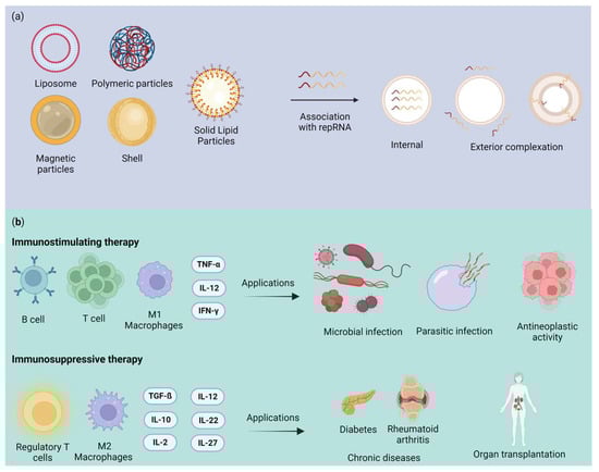 Overview of the use of nanoformulations associated with repRNA: (a) examples of nanoformulations and forms of association with repRNA; (b) immunomodulatory potential of nanoparticles associated with repRNA and therapeutic application, either by immunostimulation or immunodepression. The information contained in this illustration was based on the work of Blakney [144] and Feng et al. [145]. Created with BioRender.com (accessed on 2 October 2023).