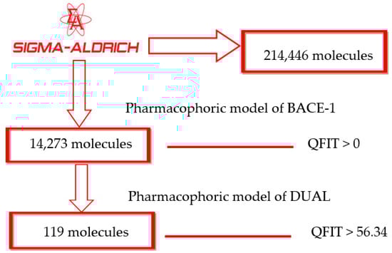 - Palakurti, R.; Vadrevu, R. Pharmacophore based 3D-QSAR modeling, virtual screening and docking for identification of potential inhibitors of B-secretase. Comput. Biol. Chem. 2017, 68, 107–117. [Google Scholar] [CrossRef] [PubMed]