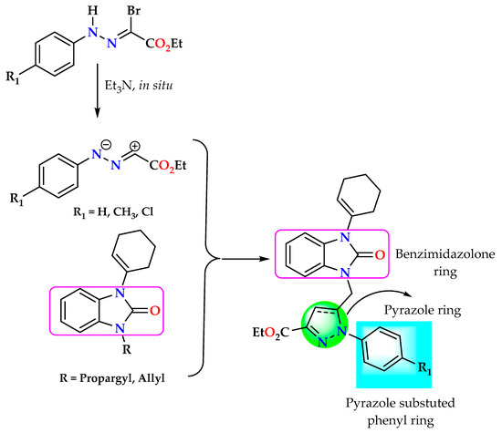 We successively introduced in a 100 mL flask equipped with a condenser and a CaCl2 guard, 10 mmol of N-propargylbenzimidazol-2-one (2) or N-allylbenzimidazol-2-one (3) and 9.10 mmol of hydrazonoyl bromide in 20 mL of anhydrous toluene. A total of 4 mL of triethylamine was carefully added to this mixture using a dropping funnel. The resulting mixture was then subjected to magnetic stirring and heated to reflux for 48–72 h. Triethylamine hydrochloride was formed during this reaction and filtered out while still hot. The solvent and excess triethylamine were subsequently removed using a rotary evaporator. The remaining residue was purified by column chromatography using hexane/ethyl acetate (8/2) as the eluent. The final product obtained from this process was further purified by recrystallization from ethanol to yield the desired compounds.