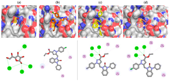 The 3D and 2D representation of molecular docked complex of ascorbic acid (a), 5c (b), 6b (c), and 6c (d) with the active site of PRDX5 (PDB ID: 1HD2).