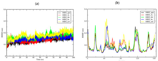 RMSD of c-α backbone (a) and RMSF for c-α atoms (b) of the 1HD2_apo, 1HD2_5c, 1HD2_6b, 1HD2_6c, and 1HD2_ref (ref = benzoic acid).