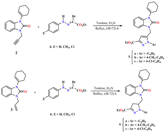The synthesis of novel pyrazole benzimidazolone derivatives consists of three main steps (Scheme 1 and Scheme 2). In the first step, the 1-(cyclohex-1-enyl)-1,3-dihydro-2H-benzimidazol-2-one (1) was efficiently synthesized by the condensation of keto-ester and o-phenylenediamine in xylene at reflux for 6 h [54]. In the second step, the N-alkylation of benzimidazolone with propargyl bromide and allyl bromide was carried out using potassium carbonate and benzyl triethylammonium chloride as a catalyst in acetone at room temperature for 4–6 h, providing the N-propargyl-benzimidazolone 2 and N-allyl-benzimidazolone 3 (Scheme 1). In the final step, compounds 2 and 3 were reacted with N-aryl-C-ethoxycarbonylnitrilimine precursors in toluene at reflux for 48–72 h to give the pyrazolyl-benzimidazolone derivatives 5 and 6.