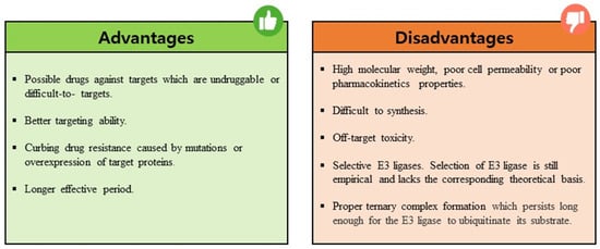Summary of the advantages and disadvantages associated with using PROTACs as a therapeutic strategy.