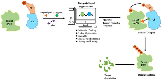 The use of PROTAC represents a promising therapeutic approach aimed at the selective degradation of disease-associated proteins [66,67,68]. However, the development of effective PROTACs is a complex and time-consuming process that requires extensive chemical testing and optimization. To address this challenge, computational approaches have been applied to aid in the various aspects of its development (Table 3). These approaches include molecular docking, molecular dynamic simulation, pharmacophores, and artificial techniques [69,70,71].