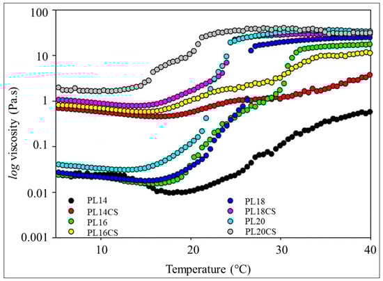 | Sample | Viscosity at 5 °C (Pa.s) | Viscosity at 20 °C (Pa.s) | Viscosity at 34 °C (Pa.s) | Transition Temperature (°C) |