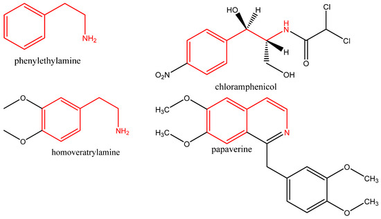 Chemical structures of phenylethylamine, homoveratrylamine, chloramphenicol, and papaverine. (2-phenylethylamine residue is in red).