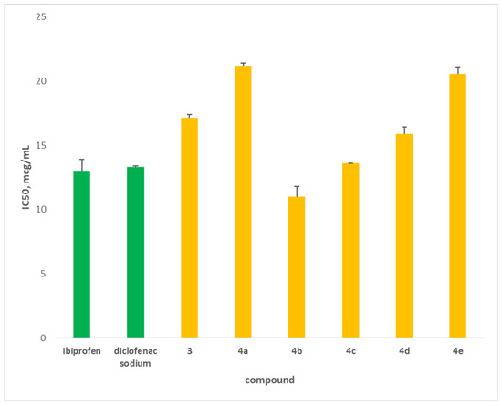 The novel hybrids were compared to two well-known anti-inflammatory drugs, diclofenac and ibuprofen. The main purpose of this study was to evaluate the prevention of albumin denaturation for novel hybrids. This approach estimates the degree of denaturation resistance of the albumin molecule. The data showed that hybrid 4b (11 μg/mL) possessed the highest degree of albumin protection against denaturation compared to the standards (Figure 3). The hybrid 4c (13.6 μg/mL) has similar protection as that of diclofenac and ibuprofen, followed by 4d (15.9 μg/mL). The other hybrids have lower-than-standard activity. We can explain these data with the structure of the hybrids, which have phenyl, substituted phenyl or benzyl substituents.