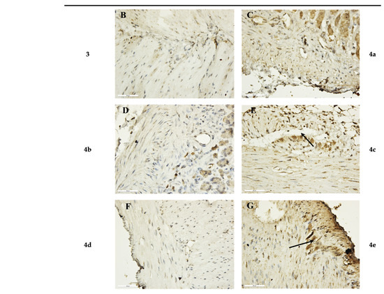 Immunohistochemical results of SM after 1 h incubation period. (A) Control, with weak expression of IL-1β in the myenteric plexus (black arrows) (×400); (B,D,F) preparations incubated with the novel hybrids 3, 4b, 4d, which did not show expression for IL-1β (×400); (C) preparations incubated with substance 4a, with weak expression of IL-1β (×400); (E,G) preparations incubated with hybrids 4c and 4e, with increased intensity and density in IL-1β expression in the myenteric plexus (black arrows) (×400).