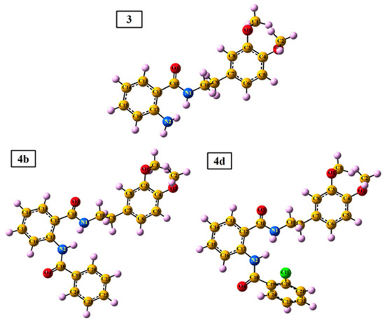 DFT calculation was performed for all the synthesized compounds, but to avoid repetition with previously published data [20] the DFT analysis was focused on three most potent of them 3, 4b, and 4d. The 3D optimized geometries of the 3, 4b, and 4d compounds are demonstrated in Figure 5. The values of electronic energy for the 3, 4b, and 4d compounds are found as −995.29, −1339.76, and −1799.37 Hartree, respectively.