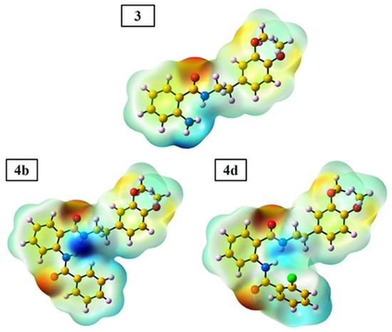 The MEP map of the 3, 4b, and 4d compounds obtained from DFT calculation.