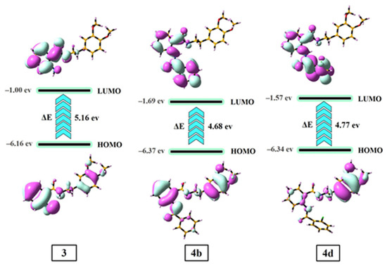The highest occupied molecular orbital (HOMO) and lowest unoccupied molecular orbital (LUMO) of the compounds influence their stability, chemical reactivity, and electronic behavior [52]. The HOMO-LUMO orbital of the 3, 4b, and 4d compounds are depicted in Figure 7.