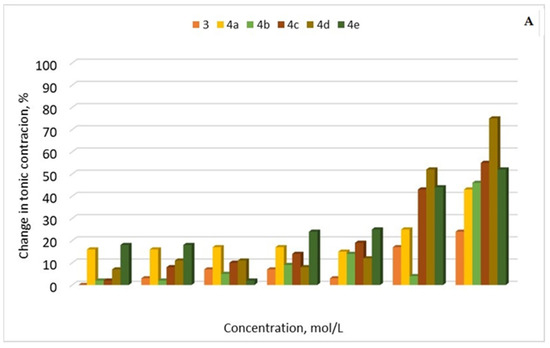 Three of the newly synthesized hybrids (4c, 4d, and 4e) caused a significant change in the tone of the SMP. The most pronounced relaxation reaction was observed at a concentration of 5 × 10−5 mol/L for all three substances, respectively: 4c—43%, 4d—52%, and 4e—44% (Figure 10A). At this submaximal concentration, we assessed the change in the amplitude and frequency of phasic contractions.
