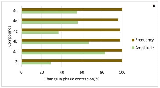 After the administration of 3 and 4a–e (5 × 10−5 mol/L), the frequency of phase contractions was between 96% to 100% for all the compounds (Figure 10B). The amplitude of the contractile response, which is the other key sign of phasic contractions, was lowered to varied degrees in the six tested drug candidates. The reduction was over 55% in the presence of 4e and 4d, 67% and 83% in the presence of 4b and 4a, respectively, and less than 37% in the presence of 3 and 4c.