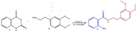 Synthesis of the starting hybrid 2-amino-N-(3,4-dimethoxyphenethyl)benzamide 3. (Anthranilic acid residue is in blue; 2-phenylethyl moiety is in red).