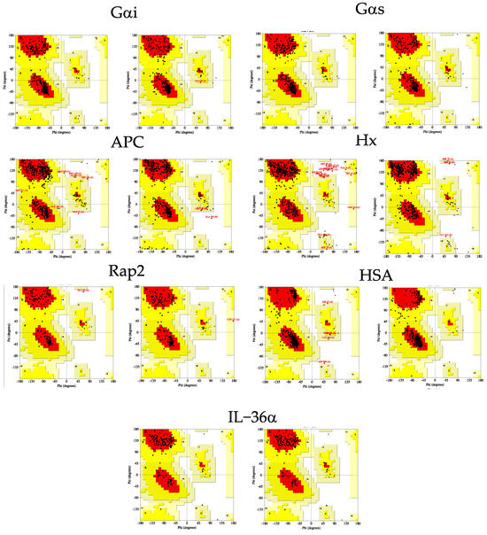 Once the structures of the proteins of interest (Gαi1, Gαs, APC, Hx, Rap2, IL-36α, and HSA) were generated from the corresponding FASTA sequences (also from the template structures selected for homology modeling), the predicted structures were subjected to a series of systematic probes of their quality by online validation tools. An in-depth analysis of quality metrics such as the accuracy of the folding, the presence of steric clashes between two unpaired atoms, the residue-wise stereochemical quality of the protein structure, and others (Figure 1) was performed. Based on the structural data obtained, protein structures were first analyzed on the basis of the accuracy of prediction of the functional sites, e.g., binding sites, and then the performance of both in silico approaches was evaluated.