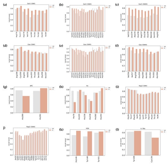 QMEANDisCo scores of the functional residues in the HM and AF-predicted models. Bars representing the functionally important residues in the HM and AF models are shown in grey and coral, respectively. Local QMEANDisCo scores of (a–c) residues in SWI-III of Gαi1, (d–f) residues in SWI-III of Gαs, (g) coordinating residues in APC, (h) coordinating residues in Hx, (i,j) residues in SWI-II of Rap2, (k) coordinating residues in HSA, and (l) coordinating residues in IL-36α are illustrated.