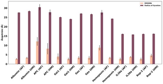 Average backbone RMSD and RadGyration parameters of the predicted structures after MD simulations. The mean RMSD and RadGyration values calculated in the production phase of the HM and AF-predicted structures are shown in peach and claret error bar graphs, respectively. The standard deviation of the values is indicated by the black line.