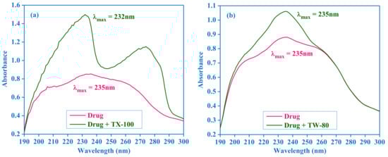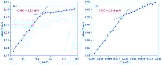Drug absorbance increases rapidly in the post-micellar region up until CMC and then gradually drops when the drug is fully incorporated into the micelle, as shown in Figure 2. However, because more drug molecules are absorbed by freshly formed micelles, absorbance might occasionally increase slowly even after CMC [35]. The typical CMC values of TX-100 and TW-80 in water are 0.2 mM [36,37] and 0.015 mM [38], respectively. The CMC value is increased to 0.24 and 0.018, respectively, after CEF is added to the aqueous solution of TX-100 and TW-80. This is because of the structure-breaking effect of CEF, which destroys water structure and increases entropy, rendering the micellization entropically unfavorable and increasing CMC [39].