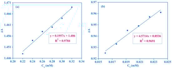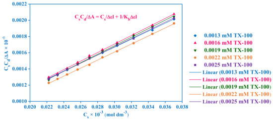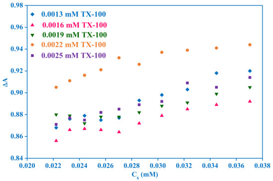 The relationship between differential absorbance and surfactant concentration is clearly depicted in Figure 3. Here, an increase in the differential absorbance was observed. A gradual increase in the ΔA values with an increase in surfactant concentration indicates that drug molecules are still being incorporated from the aqueous associate with the micelles formed by TX-100/TW-80 systems [40,41]. The data obtained for the differential study of TX-100/TW-80 systems is tabulated in Table 1 and Table 2, respectively, and calculations for partitioning and binding constants were performed using Equations (1) and (5).
