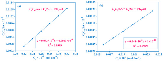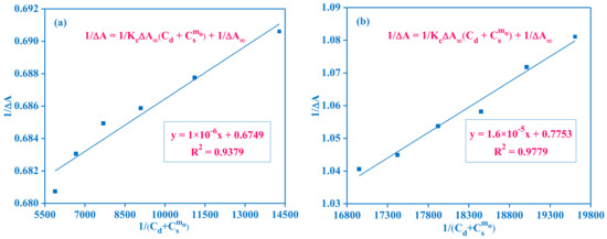 Kawamura plot between 1/ΔA and 1/(Cs + ) for calculation of Kx for (a) CEF/TX-100 system (b) CEF/TW-80 system.