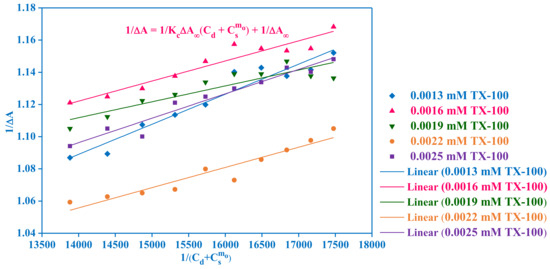 Kawamura plot between 1/ΔA and 1/(Cs + ) for the calculation of Kx in a mixed micellar system.