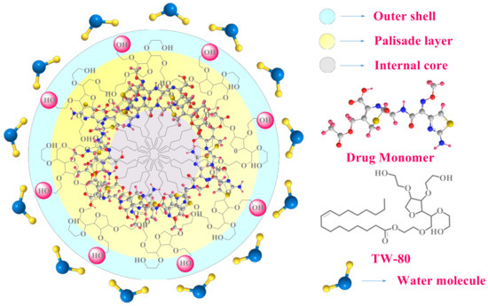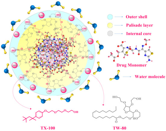 In general, the efficacy of micelle solubilization increases with decreasing core polarity on a molar basis. The micellar core polarity for TX-100 is 1.40, and for TW-80 is 1.13, which indicates that, compared to TX-100, the micellar core of TW-80 offers a substantially more accepting environment for poorly water-soluble molecules in aqueous solution, indicating more effectiveness in solubilizing water-insoluble compounds [61]. The higher value of the binding coefficient for the micellar system of TW-80 compared to TX-100 also proves the deep penetration of drug molecules and thus demonstrates a higher solubilization power. Scheme 3 and Scheme 4 depict the position of the drug monomers in the single micellar system of TW-80 and possibilities for interaction between the monomer of the drug and surfactant molecules, respectively.