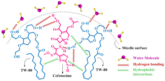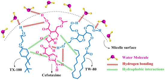 The release of cefotaxime from the micelles of TX-100 and TW-80 in a biological system involves a combination of diffusion [62], environmental changes [63], and competition with biomolecules. Diffusion plays a significant role, with the high concentration of cefotaxime inside the micelle driving its movement towards areas of lower concentration in the surrounding biological fluid, such as blood or interstitial fluid [64]. Environmental alterations, such as temperature and pH, can influence micellar stability and structure. While TX-100 micelles are generally more pH-sensitive and relatively less stable over a wide pH range [65,66], TW-80 micelles are less pH-sensitive [67]. Because of the acidic environment in the stomach, the pH in the stomach is relatively low (typically around pH 1–3) [68]. At such low pH values, the acidic conditions can lead to the protonation of TX-100 surfactant molecules, which can disrupt the hydrophobic interactions within the micellar core [69]. The release of cefotaxime is facilitated by the micelle disintegration, making the drug available for absorption and therapeutic activity downstream from the gastrointestinal system. From the intestinal blood vessels, the absorbed cefotaxime is then transported to the liver to finally reach the systemic circulation [70].